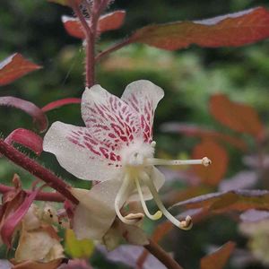 「花曜日」 梅雨に山で、ひっそりと咲く花。 バイカツツジ(梅花躑躅) ツツジ科ツツジ属の落葉広葉 低木 横向き、あるいは若干反り返ったように花弁が展開する。 花は直径2cm程と小さく、まばらに咲くことと、葉の下に付いている為、目立ちません。 雄しべは5本、上2本が短く、軟毛を密生する。 葉は枝の先端に輪生状に集まる。 花は葉が展開した後に、わざわざ葉に隠れるように斜め下を向いて咲く。 わざわざ葉の下を覗き込まなければ、お花を発見出来ません。 雨に打たれないように、葉の下に咲くのでしょうか? 梅雨の山も、楽しめますね。