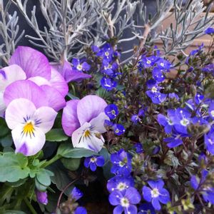 植えてから十日程たって、プランターから溢れてきたベロニカオックスフォードブルー。 赤紫の葉が特徴的でしたが、今は葉は普通の緑で、可愛い青い小花だけが目立ちます 😲🧐🌿🌿