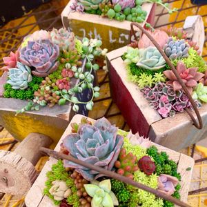 宮城県名取市のイベント 「MUSASHI祭‼️」に出品する 寄せ植え作り始めました🤗 picはメッセージタブロー寄せ✨ 爽やかな夏色多肉をギュギュッと詰めたよ💕 bizarre farmブースにて販売します🎶