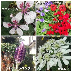 エロディウム 花もが少なくなりました。 1輪車の寄せ植え ビオラ、ペチュニアは雨に濡れて光ってます。 ガーデンシクラメンは たくさん咲いてます。 フレンチラベンダー 穂が出てきました。 オルレア 中央がコン盛りなってます。