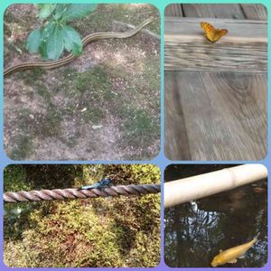 南禅寺 天授庵のお庭で見かけた生き物達 シマヘビ シオカラトンボ 金色の鯉 右上のチョウ、オレンジ色が綺麗でした🐍🦋 令和元年6月21日 撮影