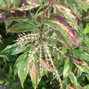 連休は実家に行ってました😊 実家シリーズ🍀 上は裏の空地のオギとセイタカアワダチソウ🍀 右下は景石の上に生えた苔🍀 左下は斑入りガクアジサイとアメリカイワナンテン‘レインボー🍀’