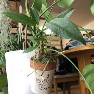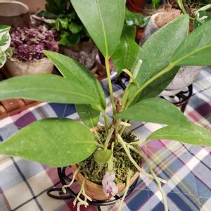 『アンスリウム・スカンデンス』 これも去年お店で見て気になっていて、めでたく今年購入したもの。 花ではなく実を鑑賞するアンスリウムだそうです🍀 で、左側の子は、こちらもずっと欲しかった、『ホヤ・リネアリス』。ホームセンターでお手頃な子が居ました😆✨ ぶら下げる所も無くなってきました…🙈💦