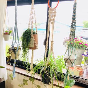 ハンギング🌟 友達が編み編みしてプレゼントにくれたのと、多肉仲間のたいちょうからのお土産のハンギング達☺️ どの子を入れるか考えてる時も楽しかったけど、吊るし終えたら、一人で絶賛👏
