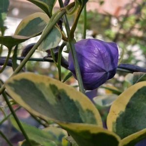おはようございます👋😃⛅ ツルニチニチソウの影で全盛期ひょろひょろで育った桔梗1輪と、ほぼ黄色くなった葉の茎から細々と伸びた枝から1輪、頑張って咲いてました💜 根性見せてくれましたね❇️
