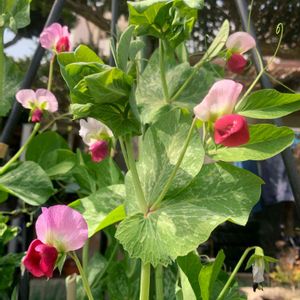 さやえんどうのお花が、沢山咲いています。 緑の葉っぱで見つかりにくかったさやえんどうが、沢山実を付けていました😃💕 豆を植えたら土が肥えると言われているので、花、実、土とお得感いっぱいです。 野菜のお花も本当に綺麗ですね✨✨