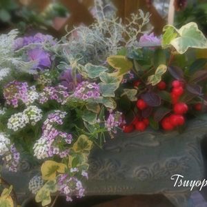 やっと冬の寄せ植え作りました♪ と言っても秋の寄せ植えのリメイクです😊 寒さに弱い鑑賞用唐辛子とケイトウ、お花が終わった宿根アスターを抜いてアリッサムとオレアリア・リトルスモーキーを植えました😅 ちょっと冬っぽくなったかな⁇