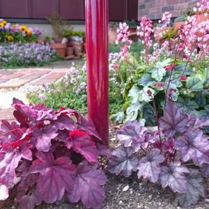ヒューケラ3種類。左:グレープソーダ、右:シナバーシルバー、奥:タペストリー。先月ポストの足下に定植。