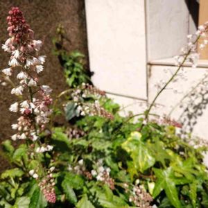 庭のヒューケラに花が咲いたー🤗 花咲くの知らんかったからびっくり!うれしいなー🤗 リシマキアがぼーぼーに生えてるから明日ばっさりいってしまおー🤗