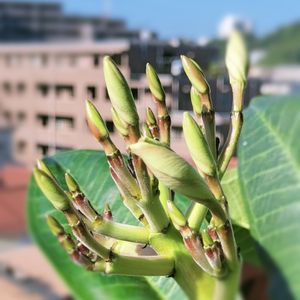 プルメリアの蕾が大きくなりました。 昨年は花付きが今ひとつだったので、今年はいつもの肥料に戻した。肥料だけでこんなに違うとは…。 ハダニ対策を怠った鉢は、同じ肥料だけど、気が付いたらハダニくんにやられちまってた💦