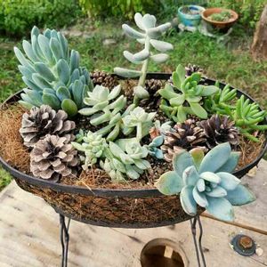 どうしても寄せ植えしたいけど保険がいない子は怖くて使えない・・・😅 でもこの器にどうしても植えたい‼ ・・・やっぱりこうなる💧 スカスカ・・・と、言うより明らかに肉足りてない‼ こんなときは必殺松ぼっくり‼ 秋を演出してみましたぁ~⤴💕 なんちゃって😅💦🎵
