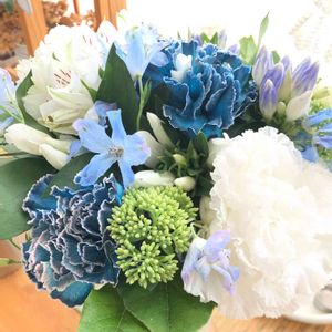 今朝の1枚 花束💐 娘から、少し遅めの誕生日プレゼント頂きました🎁 お花はピンク系が好きですが、私の好きな色は青、紫です💙💜 ママのイメージは青と黄色だよね。と娘は言っておりました💠🌻 黄色はひまわりのイメージだそうです☺️ 真夏に生まれたので、誕生日はいつも暑いです☀️🏝 私好みの花束をありがとう💗