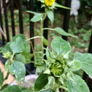 🏷金曜日の蕾たち 遅く撒いたミニひまわり まもなく咲きそう〜‼️ 奥は咲き始め〜🌻 昨日休みだったから 曜日感覚狂ってた〜😅