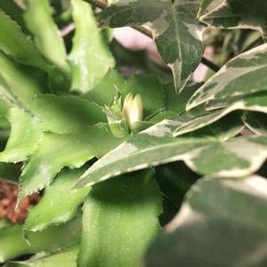 Den. Cassiお pe variegata 中斑カシoープさん、やっと花芽がしっかり出てきてくれたぁ~😭💖 待ってたよ~✨ 裏側だけだけどよく良く見ると、花のフチだけ緑色✨ これ、開いた時に何らかのカタチで残ってくれたら 斑入りが花にも影響していて綺麗だろうな~😍 このコも花画像がなく、元の持ち主さんはハッキリお花を覚えていないので どんな花かは、咲くまでのお楽しみ。 まだちょっと開花までにはかかりそうだから ワクワク待っているところ😆✨ 基本的にはミモ3さんとこのカシoープさんと同じ系統の色だと思うけど やはり、うちのはもう少し真ん中が白く抜けそうかな❔ その違いも楽しみ~😊