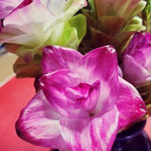 クルクマの小さな紫色の花が咲きました☺️ 上の大きな白い花みたいな部分は花ではないっていうのが不思議。 お供えの花にしたいけど、せめて2本はないとなぁ。どんどん花芽出てこないかな?とりあえず、液肥買わなきゃ。