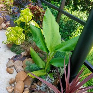 南国を醸し出している カンナに思わせて 実は春ウコン🌸 奇跡的に越冬して カラーリーフとして使ってます🌱 葉の裏に毛があって フワフワして気持ち良いんです🤭✨ 春ウコンは春に花を咲かせるようなのですが こちらでは見れないかな~🤔