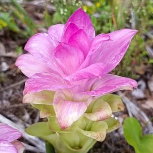 春ウコンの花(苞葉)です。 ショウガ科クルクマ属の多年草 里山へ行く途中の地元の人の畑に生えていました。 本当の花は下の方に黄色く咲きますがまだです。