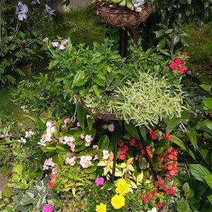 現在の3段タワー✨ 葉っぱがワサワサに😅 一番下の段のみ、鉢を入れ替え出来るようになっていて、お花が咲いているものを常時入れ替えています🤗