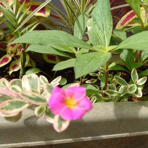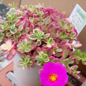 お迎えした時よりピンクが 少い😥 先祖帰りかグリーンの葉が 結構出てきて、ネットに どうしても出てくるので ✂️するとあった。 でも可哀想なので他の 鉢にお引っ越し。 これはこのままグリーン? 花咲いたら普通の ポーチュラカ?