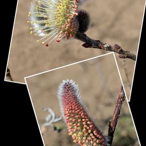 ネコヤナギの花穂 📝 雌雄異株で、雄株の葯ははじめ赤色で、黄色の花粉を出し終えると黒くなる……😳