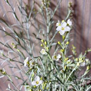 〜ゴンフォスティグマ〜 通りがかったお宅の庭に咲いてる花を見せて頂きました ちょっと変わった名前の植物ですね 私は初めて知りました ヤグルマギクのようなシルバーリーフで、白い可憐な花がとても可愛い花です 調べてみると 草花ではなく何と常緑低木でした 丈は2mにもなります 葉茎が放射状にワイルドに伸びていました② フジウツギ科ゴンフォスティグマ属 花期:春〜秋 原産地:南アフリカ 英名:River star 花言葉:「秘密のひととき」「小さな愛」 🏷️白い水曜日♡