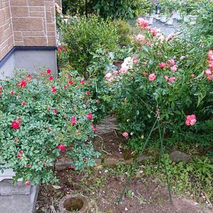🌹フロントガーデンを横から 来年はレッドレオナルドダ・ヴィンチをオベリスク仕立てにする予定で~す。