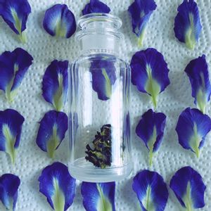 バタフライピー 花が咲いたらすぐに洗ってシベを取って冷凍していたのですが、貯まってきたので、今度はドライにしてます‼️ オーガニックのバタフライピーティーは50g2000円弱で売っていて案外お高いです~😅 並べてある分で花四つ分。 瓶の中にも四つ分‼️ 部屋の中で乾燥させます。 三株でどれくらいの花びら取れるかな~💦