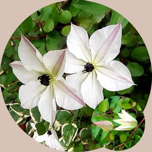 R6.5.14(火) おはようございます。今日は朝から良く晴れていて、気温もグングン上がりそうです。 クレマチス𓂃 𓈒𓏸𑁍 ヴィチセラ系 サニーサイド グリーンホワイト地に弁先から中央にかけて淡赤紫がかる中輪の上向き咲き。四季咲き性。トレリスに絡ませたり、鉢植え向きと紹介されています。 中輪の花が風に揺れてフワフワしている姿が何とも可愛らしいですꕤ︎︎·͜· ︎︎