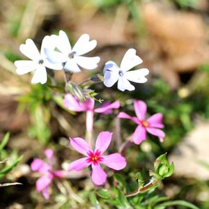公園にて 芝桜(シバザクラ) 枯れ葉の下で越冬していた蕾が、次々立ち上がってきました。ピンク色久しぶりです。
