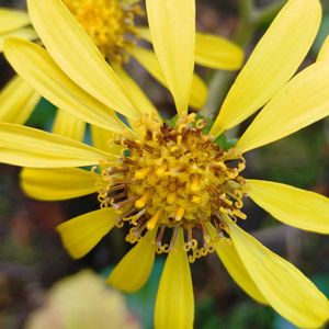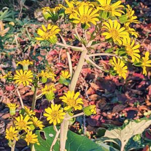 石蕗(ツワブキ) キク科ツワブキ属の多年草。海辺の植物で海沿いの崖や岩場に自生するほか、公園、庭園にも植えられる。栽培の歴史は古く江戸時代から人気があった。花の少ない晩秋から初冬にかけて花を咲かせるため今なお根強い人気を誇る。日陰でもよく育つので庭に植えられることも多く、葉に斑が入ったものなど園芸品種も多い。根生葉は長さ10~30㎝の柄があり、葉身は腎心形で厚くて光沢がある。若葉は握り拳のようにまるまり、灰褐色の軟毛をかぶっている。花期は10~12月。葉の間から太い花茎を伸ばし、黄色の頭花を散房状につける。頭花は周りに雌性の舌状花が1列に並び、中心部に両性の筒状花が多数集まる。痩果は長さ5~6.5㎜。冠毛は淡褐色で、長さは痩果と同じかやや長い。 春先の葉が開く前の葉柄は佃煮にして食べられる。乾燥させた根茎を煎じて飲むと健胃、下痢止めに効く。魚中毒のときは生の葉の絞り汁を飲用する。葉にはヘキセナール、タンニン、葉緑素を含む。これには抗菌作用があり、皮膚の炎症を鎮め、傷を快復させる作用がある。カラスは腐った魚を食べたあとにツワブキを突付くという。 名前は、葉に艶があって蕗に似ているため『ツヤブキ』となり、転訛してツワブキになった。 出典『野に咲く花』『散歩の草花図鑑』『薬草の呟き』