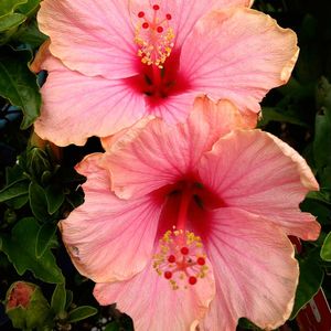キャバレーブリーズ💗🥰💗ハイビスカス🌺 仲良くふたつの笑顔 右側の赤色の蕊が無い……折れたと思ったら のぞいてよく見るとありました(上の拡大写真☆付けました) 途中に🔴😂なぜそこで止まったの?