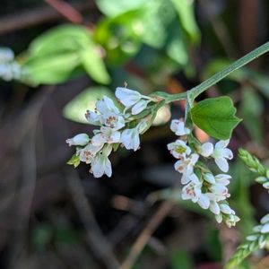 シャクチリソバ(赤地利蕎麦) タデ科ソバ属 水路で未だ咲いていました 若い実も見えます 草刈り隊が来なければ実が熟した所も見られるけど😃🎶 ソバは種を蒔くと3ヶ月で収穫できる一年草ですが こちらは多年草です🌿 実は食用にならず薬用植物として導入されました 小石川植物園から逸出した物が野原や河川敷で野生化しています😅