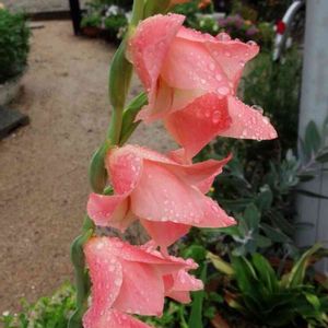 ピンク色のグラジオラスさん です 雨の雫が似合います♪
