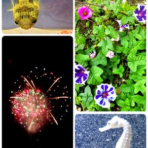 こんにちは👋😃 昨日は地元シンボルタワーで行われているスカイアクアリウム見てきました🎵海無し県では中々見られない小さな海の生き物が見られました🎵 その中でも白いタツノオトシゴや小さなフグが可愛かったですよ💕ニモやカラフルな魚やチンアナゴなどもいましたよ😄✌️ 畑ガーデンでは朝顔やポーチラカが可愛く咲いています💕 夜は花火大会近くで見る花火は圧巻ですね~🎵😍🎵