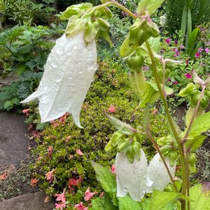 雨上がりのホタルブクロ(白)。 少し肌寒い曇天の下で白花が咲いています♪