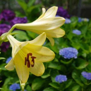 庭に咲く花ユリ&アジサイ 黄色のスカシユリがやっと咲きました🎵 同じ鉢で濃い赤・薄い赤そして黄色の順番に咲きました😊 追伸 らにいーさんからコメントがあり教えていただきました。 テッポウユリとスカシユリの交配のデリアナとのことです😅