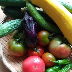 小雨の中の収穫!蚊がブンブン顔がボコボコ にされながらの収穫でした。今日の夕ごはんは、ラタトゥーユにしようかな✨💕
