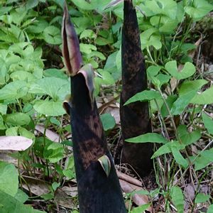古屋敷の竹やぶ 真竹(マダケ)あがりだしました横にはマムシソウも今は赤、モソウダケのときは みどりがさいています