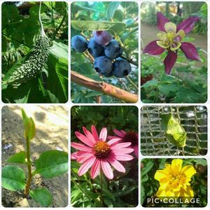 今日は晴れ間が見えてお写真たくさん撮ってしまいました(*´▽`) 今年はゴーヤがいつもより早くもう沢山出来始めています✨ オカワカメは3年前に植えた物が今年も🌱を出しました。 家のブルーベリーは1本で大きめの実をつけて食べ頃に~😋 そのブルーベリーのネットに今日は揚羽蝶らしき蛹が💦 種採りからのマリーゴールドが今年も咲き始めてくれました🌾 今になって花壇で咲いたオダマキが今まで無かった素敵な色でした~💕