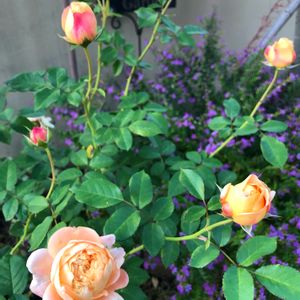 クリスマスや年末の話が出てるけど、まだ暖かい11月😊 ラ・ドルチェヴィータ🌹沢山咲き始めました💛 後ろには地植えで大きくなった花壇のクフェア💜