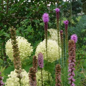 畑のアナベルとリアトリス💜 三年前に、リアトリスの横にアナベルを植えました☘️ 鉢に入ってたアナベルは、ひ弱で細かったのに、今ではリアトリスを押し除けてアナベルが大きくなりました〜 アナベルさんは意外に強いんですね~🤩🐰✨