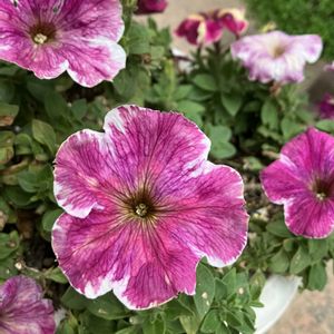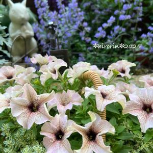🍃ꕤ*.゚インカのペチュニア 『ロイヤルミルクティー』 お迎えした頃はクリーム色に茶色のレースが入り、ミルクティーのような色合いてした。 咲き進むと段々ピンクがかってきます、💓1枚目はバラの咲く頃…ちょうど咲き揃った様子💮 2枚目は満開で切り戻し前です。 夏の花ではあるけれど、気温37〜39℃ともなると、お花が萎れてしまうので、今は⛱パラソルの下へ移動して守っています🤲🏻 花数は減りましたが、秋まで咲いて欲しいです😅