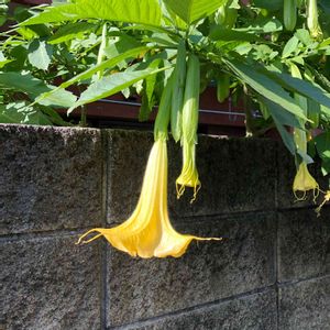 なんかまたとんでもないものを見かけたような… 黄色いラッパのような形の花。 結構大きかったです。 名前を教えてください🙇