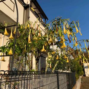 2019.12.18撮影。 薬局前のエンジェルトランペットです。 鉢植えで、これだけの大株に育ってるなんて見事です。