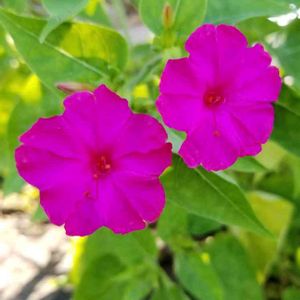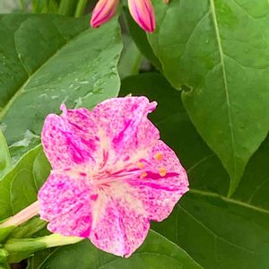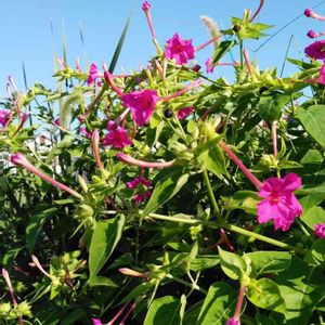 オシロイバナ(白粉花) 英名:Four O’clock 別名:ユウゲショウ(夕化粧)、ミラビリス 花言葉:「臆病」「内気」「小心」「遠慮」 鮮やかな発色のお花✨ 夕方4時頃から翌朝にかけて開く一日花です。 単色のほかに絞り咲きや染め分けがあり、同じ株から異なった色のお花が咲きます。 しわしわの黒いタネを割ると、中の胚乳が真っ白い粉状で、まるで白粉のように見えることから名づけられました。