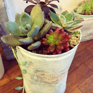 最近、ブリキ缶をリメイクすることの楽しさを知りました😊 なかなかうまくはいきませんが、自分で作ったリメ缶だとよけいに多肉ちゃん植え付ける楽しみが増えますね(●︎´艸`) 今では、カンカンがお宝に見えてきてます♪︎"(∩︎>ω<∩︎)" 手前の少し大きな多肉ちゃんの名前がわかりません( ´•̥_•̥` )