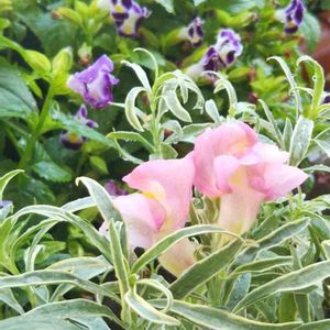 キンギョソウ アンテリナムシルバーストライプ 斑入りの葉っぱと花色が可愛いキンギョソウです💗 秋らしくなったと思ったら急に咲き始めました😆💕 夏の間は大きなズッキーニの葉っぱの下で直射日光から守ってもらっていました。ズッキーニさんありがとう😊 斑入りの葉っぱに混じって、ま緑の葉っぱがニョキニョキ🌿🌿🌿😵 これはcut✂した方がいいんだろ〜なー💦