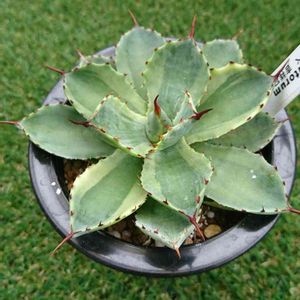 アガベ 吉祥冠錦 最近元気なアガベシリーズ✋️ 今日は吉祥冠錦🤗 うす緑色の葉、クリーム色のふち、ノギの赤が良い感じです👍