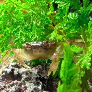 サワガニと苔 慌てふためいてカメラの下を駆け上がる🦀 私と?ある程度の距離が出来てから、振り向き 「何をしてるんだ!?」と言わんばかり 暫くこのままの状態をキープ