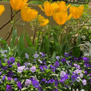 〜🌱地植えコーナー🐜〜 おはようございます🌿ビオラは植えっぱなし、チューリップはブルーベリーの枝の間から出てきました💦 配置はイマイチでしたが…今日もお花たちから元気をもらって頑張ろう💛